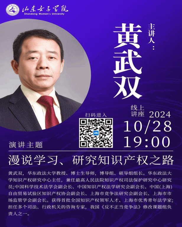 10月28日,社会与法学院(社会发展学院)邀请华东政法大学黄武双教授为师生开展题为“漫说学习、研究知识产权之路”的学术讲座,社会与法学院师生100余人通过线上方式参加。