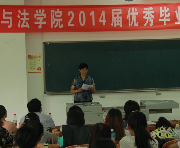 7月8日下午,在2014届毕业生即将离开母校的时刻,为了总结、交流学习经验,表彰先进,激励在校生,社会与法学院举行了2014届优秀毕业生表彰奖励大会。院长范素华应邀出席大会,招生就业处、教务处负责人,社会与法学院负责人、各专业教师代表、2014届毕业生以及在校学生代表参加了大会。