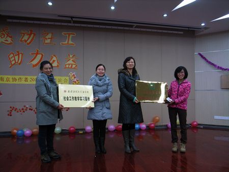1月3日,社会与法学院副院长张雅维、社会工作教研室主任闫小红、赵记辉老师受邀参加南京协作者社区发展中心年会,并举行了社会工作专业实习基地的挂牌仪式。