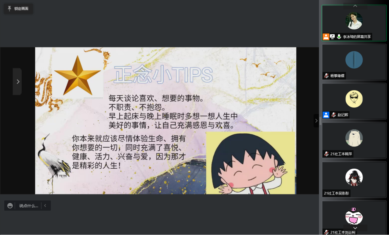 为进一步激发社会工作专业学生对未来大学生活的热情,2022年4月15日晚,社会工作专业在腾讯会议举行“云学堂”:向上的力量优秀学生分享会。本次会议由社会工作教研室主任赵记辉主持,邀请2020级社会工作本科班李冰琦同学作为分享人,社会工作专业80余名学生参加。