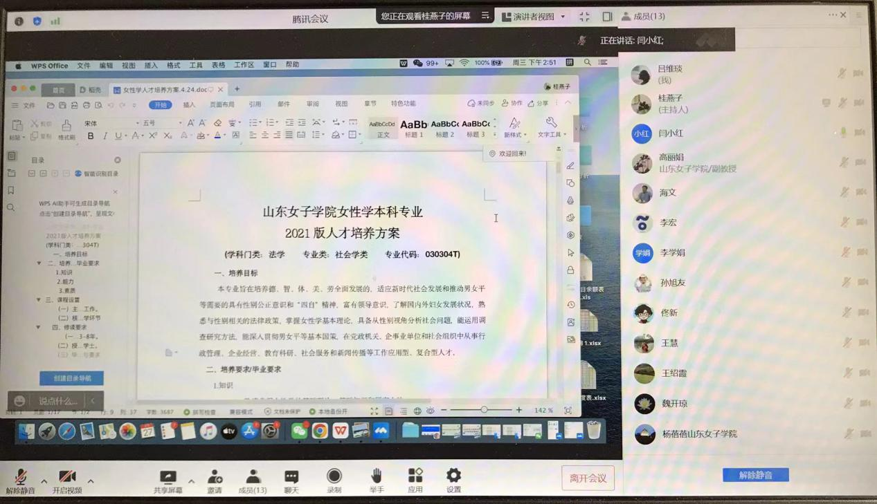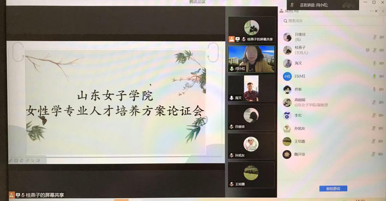 4月27日下午,社会与法学院在腾讯会议召开女性学本科专业人才培养方案论证会。中国妇女研究会会长、厦门大学博士生导师、山东女子学院特聘教授叶文振,北京大学社会学系博士生导师佟新教授,中华女子学院女性学系主任、硕士生导师魏开琼教授应邀出席会议。山东女子学院教务处副处长李宏、妇女研究所主任王慧、社会与法学院副院长王绍霞、副院长孙旭友、社会与法学院女性学教研室全体教师参会。社会与法学院院长闫小红主持会议。