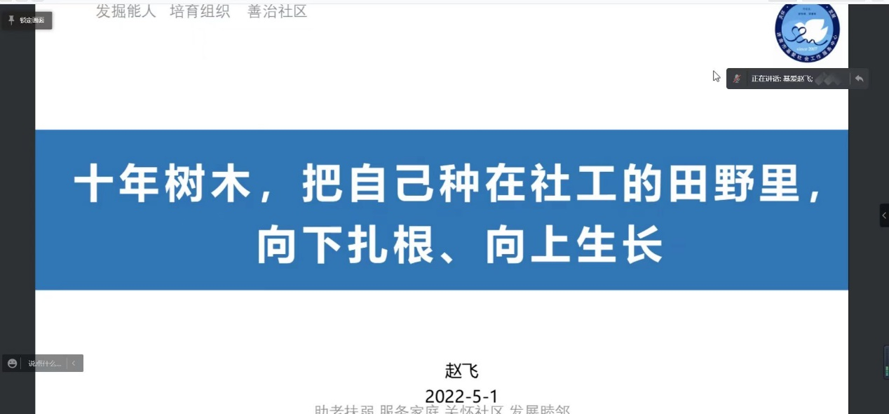 为促进学生了解专业前沿,2022年5月1日上午,社会工作专业邀请优秀毕业生,济南市基爱社会工作服务中心督导主任赵飞进行了线上社会工作实务经验分享会,2020级、2021级社会工作专业全体同学参加,分享会由社会工作专业教研室主任赵记辉主持。