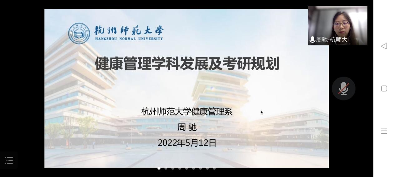 周驰教授的报告题为《健康管理学科发展及考研规划》,首先介绍了健康管理学科整体发展及杭师大健康管理学科的建设情况;其次,介绍了健康管理硕士的备考建议和健康管理硕士的就业前景。与此同时,周老师还向同学们分享了杭师大健康管理硕士的研究方向、研究生初试的复习计划及复试的注意事项等同学们迫切关心的问题。