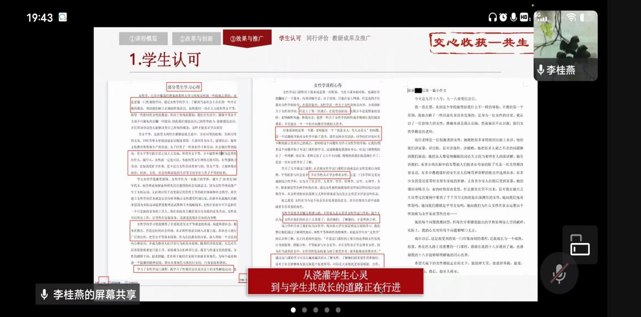 李桂燕老师以自己参加的山东省教学创新比赛为例,分享了《女性学》课程多年的教学创新经验,并从课程概览、改革与创新、效果与推广、比赛体会四个方面讲解了整个教学创新比赛,鼓励青年教师积极参加这项比赛。