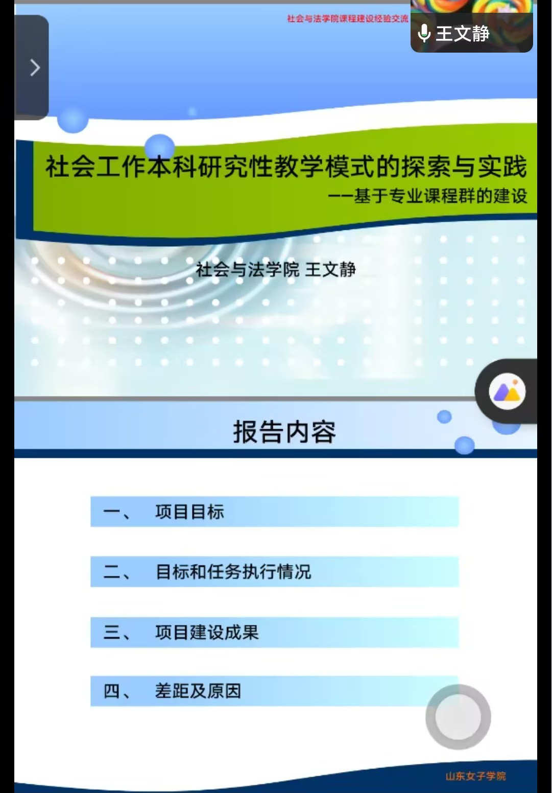 王文静老师基于自己多年的社会工作专业课程群教学改革经验,向各位老师分享了社会工作本科研究性教学模式的探索与实践,包括项目目标、目标任务和执行情况、项目建设成果、差距及原因等四个方面。