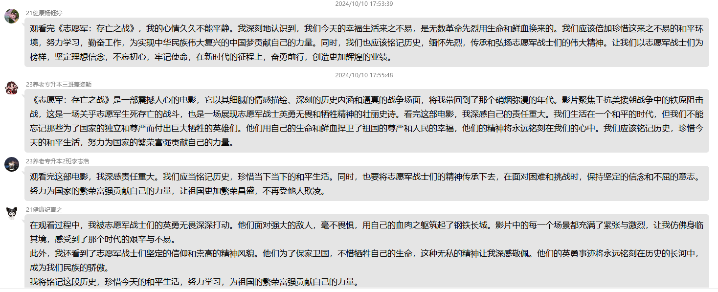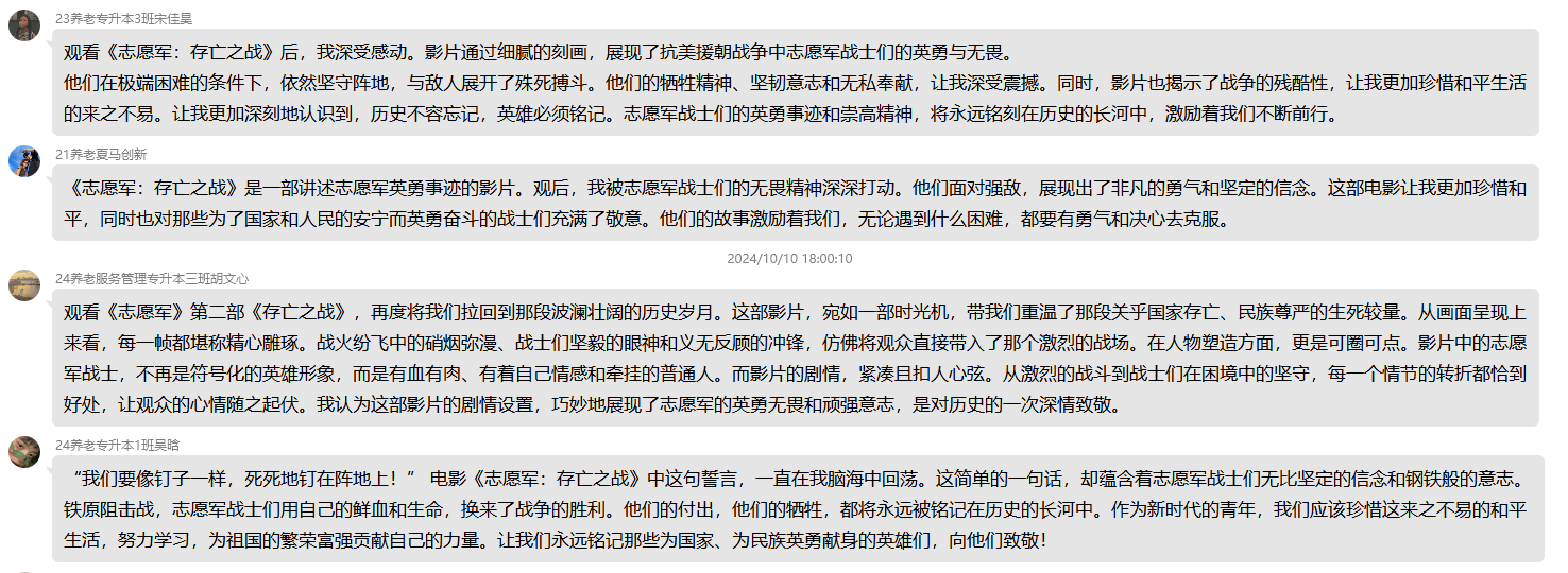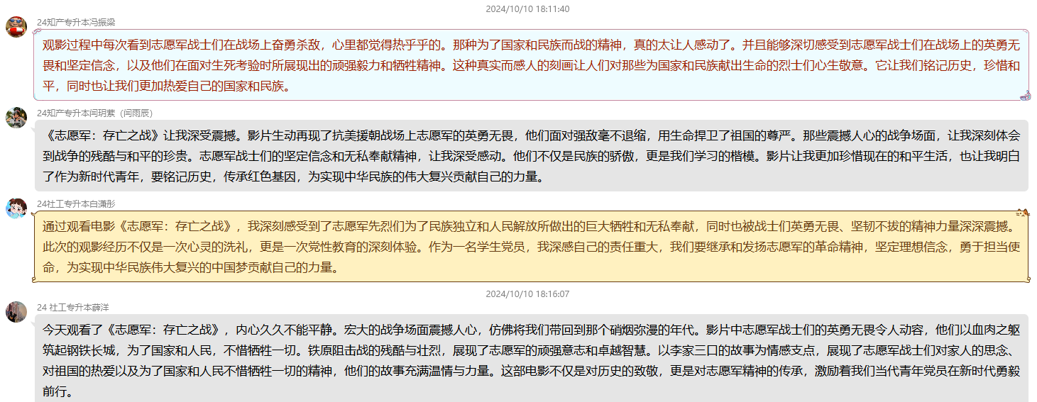 观影结束后,党员们积极开展了热议。学生第一党支部党员白潇彤表示:“通过观影,我深刻感受到了志愿军战士们为了民族独立和人民解放所做出的巨大牺牲和无私奉献,同时也被战士们英勇无畏、坚韧不拔的精神力量深深震撼。此次的观影经历不仅是一次心灵的洗礼,更是一次党性教育的深刻体验。作为一名学生党员,我深感自己的责任重大,我们要继承和发扬志愿军的革命精神,坚定理想信念,勇于担当使命,为实现中华民族伟大复兴的中国梦贡献自己的力量。”学生第二党支部党员张晨说到:“观《志愿军:存亡之战》,心潮澎湃,敬由心生。影片以抗美援朝为背景,展现了志愿军战士在极端条件下,以钢铁意志和血肉之躯捍卫和平的壮举。它不仅是一场视觉盛宴,更是一次精神洗礼。我们应铭记历史,珍惜和平,向英雄致敬,让他们的精神在新时代熠熠生辉。这不仅是对过去的缅怀,更是对未来的期许和责任。”党员们纷纷表示要学习先烈们的革命精神,不忘初心,牢记使命,将红色基因代代相传。