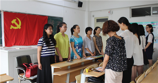 大会伊始,5个学生预备党员庄严地宣读了自己的入党志愿书,进一步明确了自己的入党动机,同时表达了对党的向往、对党的忠诚。学生预备党员还表达出他们将坚定不移跟党走,为党的工作付出自己的力量,为共产主义事业奋斗终生的愿望。随后,入党培养人对各自负责的学生预备党员的培养、教育以及政审情况提出意见,所有党员进行讨论并积极发表意见,经过无记名投票后,一致同意5名学生预备党员转为正式党员。各位党员教师对发展党员寄予希望,希望他们随时与党中央保持一致,为同学服务,做学生表率,加强自我要求。大会在全体党员高亢激昂的宣誓中圆满结束。
