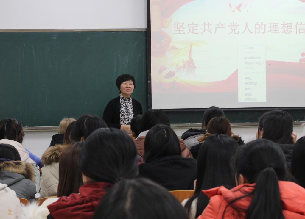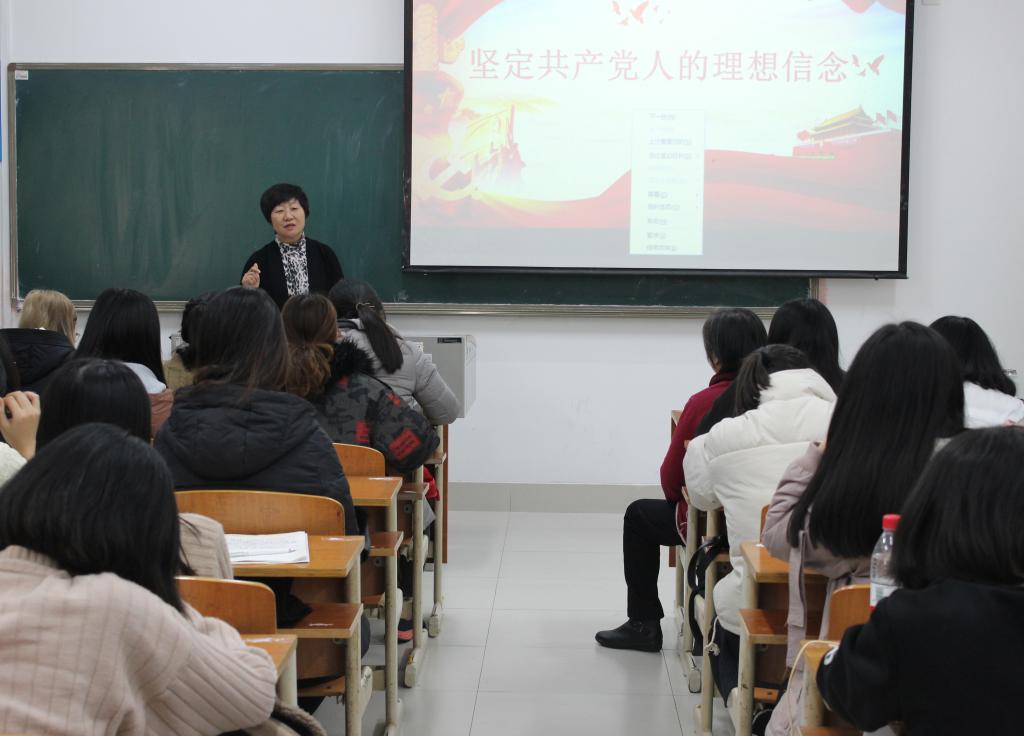 2018年12月18日下午,在博学楼215教室,党委书记郭翠芬为社会与法学院部分师生讲授“坚定共产党人的理想信念”主题党课,党总支书记、副书记、教师代表、全体学生党员与2016级部分学生听授了此次党课。