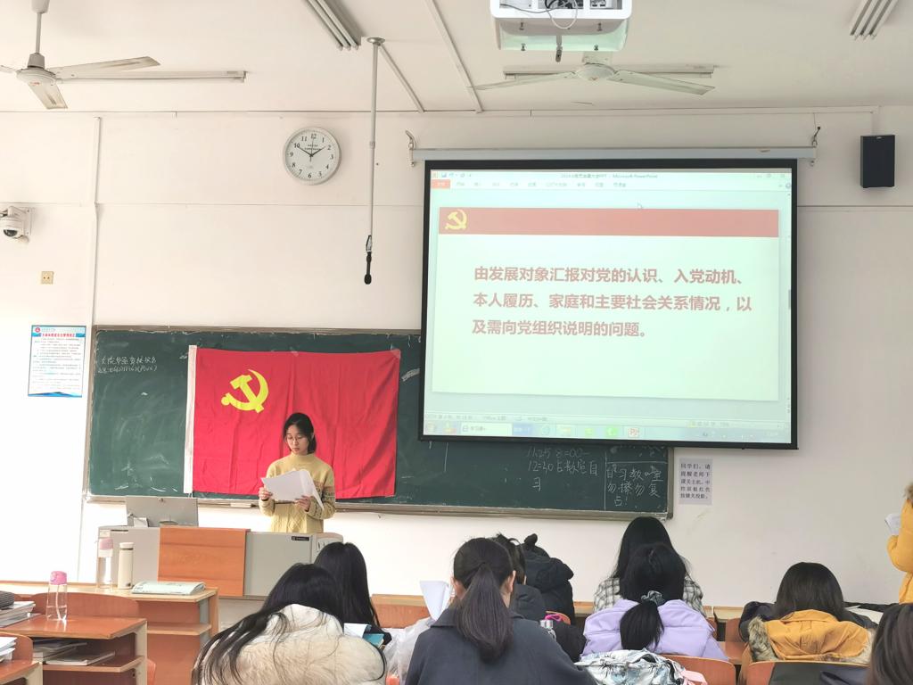 大会伊始,全体与会成员起立奏唱《国际歌》。奏唱完毕,由杨洋发表讲话,对预备党员同志提出了殷切要求。随后,大会逐个审议十六位拟接受预备党员的入党申请,各位同志依次上台宣读入党志愿书,并由入党介绍人介绍其考察情况,学生党支部介绍其政审情况,全体正式党员对其能否入党发表正式意见,由正式党员进行无记名投票,通过表决,一致同意了刘美钰等十六位同志加入党组织。最后,大会宣读关于接受刘美钰等十六位同志为中共预备党员的决议。全体同志以热烈的掌声向十六位同志表示祝贺。新党员代表许友谊同志发表了自己入党的感想并表示在以后的学习和工作中,必将更加严格要求自己,不忘初心,砥砺前行。