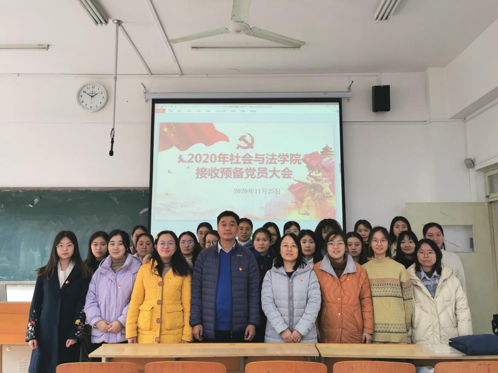 2020年11月25日中午,社会与法学院学生党支部在博学楼109教室召开了2020年接收预备党员大会。此次大会由刘汝婷老师主持,社会与法学院党总支书记杨洋、党总支副书记吴玉霞、团总支书记张扬、学生党支部11名预备党员及16名拟接受预备党员参加了此次会议。