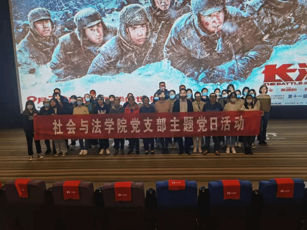 为深入贯彻落实党史学习教育的相关要求,厚植广大党员的爱国主义情怀,社会与法学院党委于2021年10月14日组织党员师生开展“观《长津湖》、明爱国志、做追梦人”主题党日活动,使广大党员在光影中感受家国情怀,追寻历史记忆,传承红色血脉。