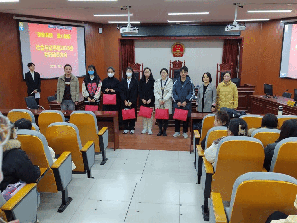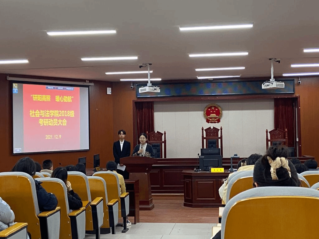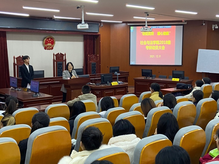 2021年12月9日下午,社会与法学院在博文楼110模拟法庭成功举行了2018级考研考前动员大会。大会以“研阳高照 暖心护航”为主题,学院党委副书记吴玉霞、辅导员刘汝婷、韦钦昊及2018级考研学生参加了本次大会。
