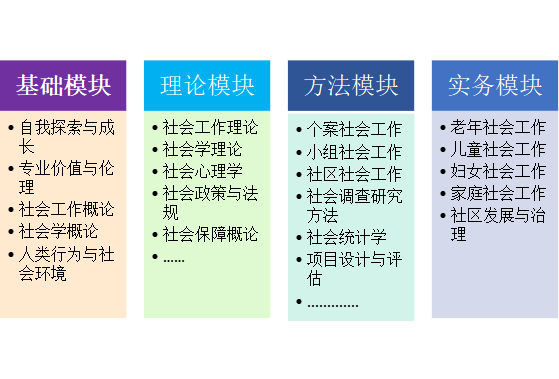 社会工作专业以社会工作、社会学和心理学为学科基础,课程涵盖社会工作概论、社会学概论、社会心理学、个案社会工作、小组社会工作、社区社会工作、人类行为与社会环境、社会研究方法、心理咨询理论与实务等。