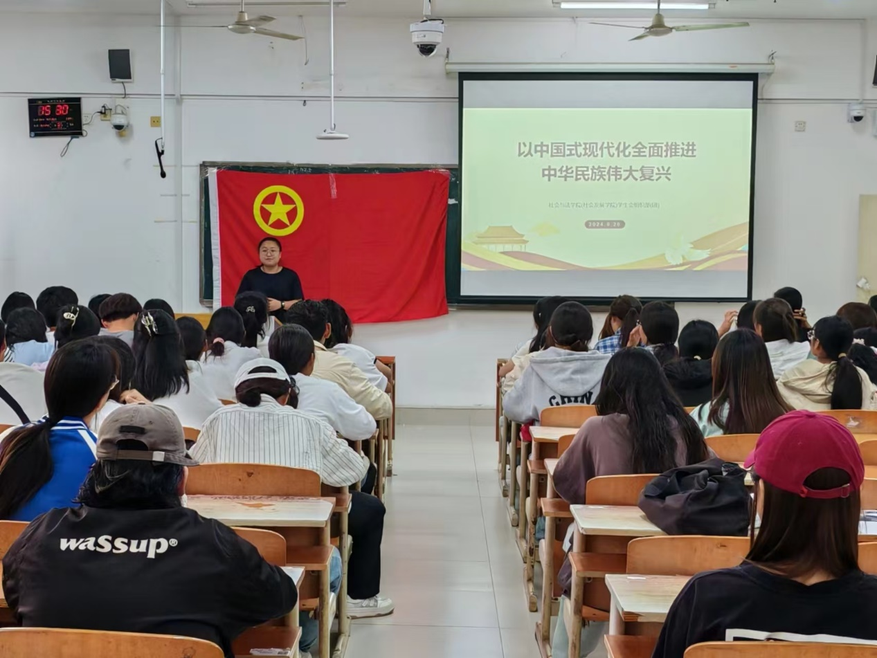 为帮助同学们强化对党的理论路线、方针政策的理解,增强对中国式现代化道路的认同感和自豪感,社会与法学院(社会发展学院)于9月26日下午在博学楼301开展了“以中国式现代化全面推进中华民族伟大复兴”的主题团课。社会发展学院辅导员管蕊、各班级共青团员代表参与本次团课。团课由王宇航主持。