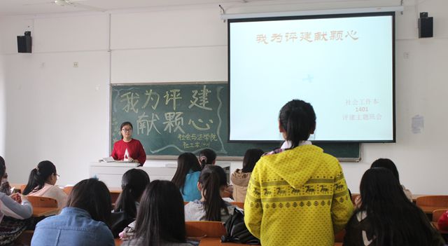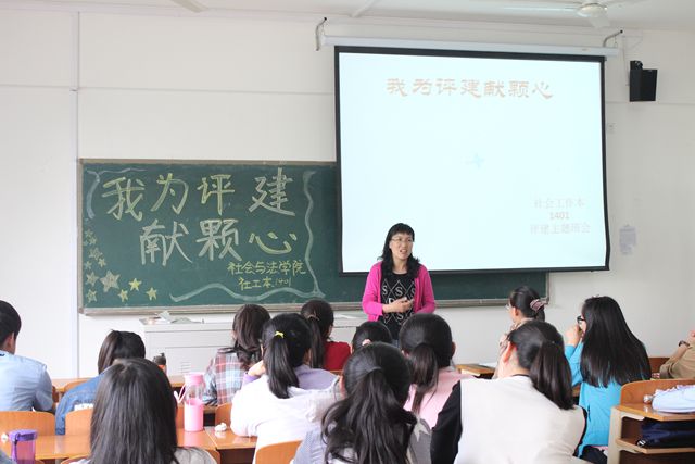 评建工作即本科教学工作合格评估,是国家对未参加过教学工作评估的新建普通本科院校开展的一种本科教学工作评估形式。为了更好地迎接评建工作,做好准备,社会与法学院14级 社会工作本科一班特召开此次评建主题班会。山东女子学院学生处副处长在本次主题班会中发表了重要讲话,她指出,“评建工作是影响学校发展的大事,但评建工 作不是为同学们增加负担,同学们需要做的事只是在平时注意自己的一言一行、每一件小事,在学习方面、生活方面做好自己该做的事情即可”。讲话后,学生处副 处长记录了一些学生反映的生活中遇到的问题以便改进,学生热情高涨,纷纷提出自己的问题。随后,社会与法学院辅导员老师对于本次主题班会做出总结,号召学 生积极为评建努力贡献自己的一份力量。