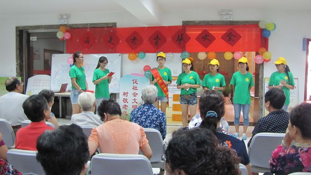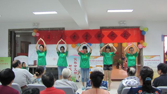 在过去的一周里,“向日葵志愿者服务队·爱夕队”驻扎在济南德福养老服务社,给老人送午餐,开展关爱老人的小组活动,走入老人家中做深入访谈,在短短的时间内与老人们建立了深厚的的感情,为老人们带去了欢乐。“消夏老青联欢会”上,该队志愿者和老人们载歌载舞,旋律轻快的健美操,充满儿时回忆的《童年》,中国国粹京剧表演,表达感恩与感谢的手语表演《感恩的心》,赢得了老人们的阵阵掌声。
