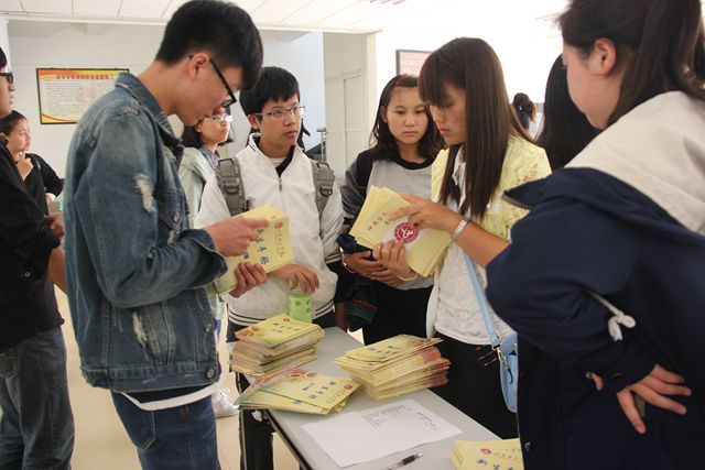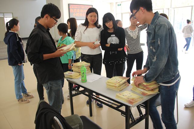 10月9日下午,社会与法学院学生会、团总支在合班楼大厅面向全校2014级新生发放《新生手册》。