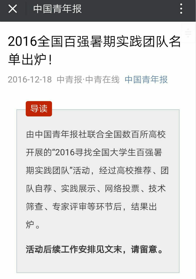 近日,由中国青年报社联合全国数百所高校开展的“2016寻找全国大学生百强暑期实践团队”活动,经过高校推荐、团队自荐、实践展示、网络投票、技术筛查、专家评审等环节后,结果出炉。社会与法学院“向日葵”志愿服务队凭借优良的服务入选全国百强实践团队。