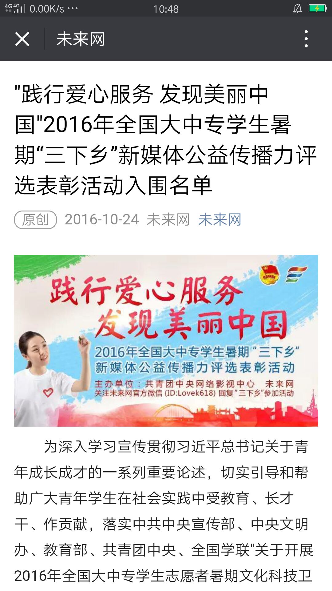 社会与法学院所组织的“向日葵”志愿服务队成功入围未来网举办的2016年 "践行爱心服务 发现美丽中国"2016年全国大中专学生暑期"三下乡"新媒体公益传播力评选表彰的活动。