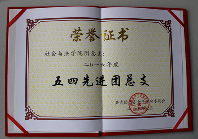 近日,在校团委组织的2016年度共青团工作考核中,社会与法学院团总支被评为“五四先进团总支”。