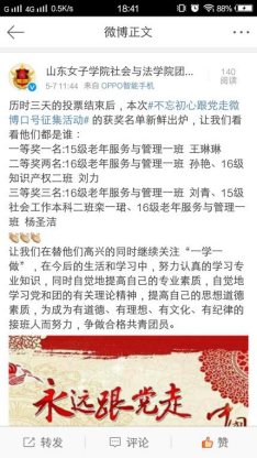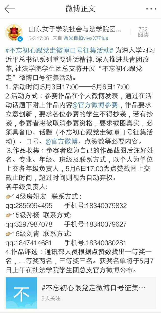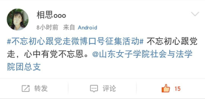 社会与法学院于5月3日至5月6日在“山东女子学院社会与法学院团总支”微博上举办“不忘初心跟党走”微博口号征集活动。