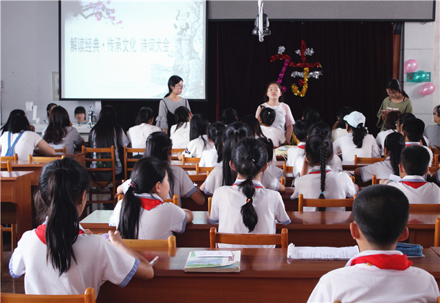 5月31日下午,社会与法学院在乐天小学举办“解读经典,传承文化”诗词大会复赛(诗词填空)。社会与法学院实习学生及招募的志愿者组织了此次活动,乐天小学36名学生参加了此次复赛。