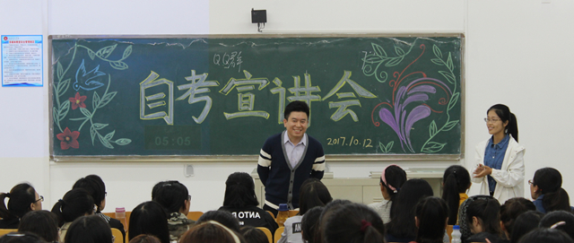 此次自考宣讲会共分为自考情况介绍、自考问题解答两部分。首先老师简单的讲解了自考的相关政策和社会承认度,并就不同专业的自考情况分别作出了介绍。为了进一步加深在座学生对自考的理解,老师从什么是自考以及自考的作用等方面详细的介绍了相关情况,并指导在座学生如何选择适合自己自考的专业和途径。老师从以往的经验出发,讲解了自考的科目和要求,在座的学生纷纷提出问题,老师也就学生提出的问题作出了解答,并鼓励学生构建属于自己的学习指南和计划,在备考过程中有一个良好的心态,现场的氛围十分融洽。此次宣讲会在全体人员的掌声中圆满结束。