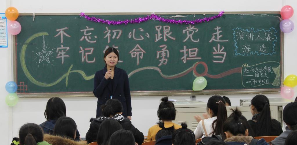 11月23日下午,社会与法学院团总支在博文楼202举行了“不忘初心跟党走,牢记使命勇担当”演讲大赛的海选。社会与法学院团总支主席团、部长以及部分学生参加了此次活动。