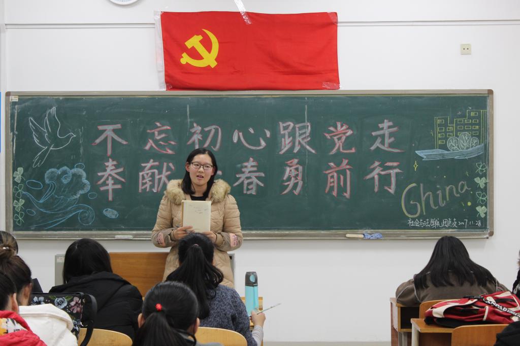 本次宣讲活动以“不忘初心跟党走,奉献青春勇向前”为主题。活动伊始,社法学院团总支主席王晓晓上前致辞,表达了召开此次宣讲活动的目的:希望参与此次活动的班干部借鉴往届学生经验,为建设更好的班级努力。两位14级优秀学生代表卢颖超和刘雅依次登台,一位讲述了党的发展历程和党的伟大,另一位分析了当前国家面临的形势与任务。她们结合工作经历和对十九大报告的理解,向16、17级班干部们传授着经验,并告诉大家要“不忘初心,牢记使命”,班干部要为同学们服务,推动优秀班级的建设,对此同学们表示收获良多。此次活动在同学们热烈的掌声中圆满结束。