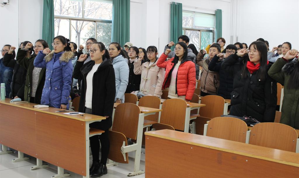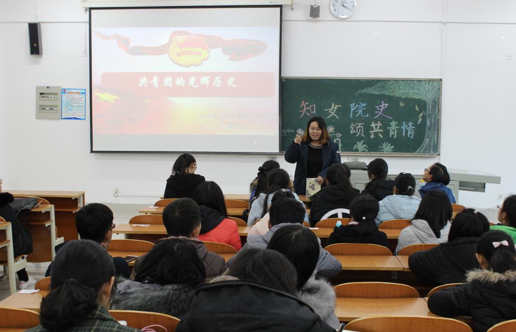 活动伊始,团总支主席王晓晓向大家介绍了山东女子学院的校史。山东女子学院由最初的山东省妇女干部学校到中国妇女管理干部学校山东分院,再到中华女子学院山东分院,在经历了几次历史性的大变化后,它没有止步不前,而是保持着积极进取的精神,再次蜕变成为现在的山东女子学院。这些光辉历史的背后,是一代又一代的学校领导、老师和学生的共同努力。随后王晓晓主席给同学们介绍了山东女子学院的校训,“坤德含鸿,至善尚美”简单的四字成语,包含的正是在校学子追求的崇尚美德、宽厚谦和的女院精神。主席动情的讲说,让在座的同学为之动容。活动最后,由主席带领大家回顾了入团誓词,让大家再一次感受到共青团的优秀与先进,嘹亮的誓词中,包含的是同学们对自己未来的憧憬,更是对校园未来的美好期待。