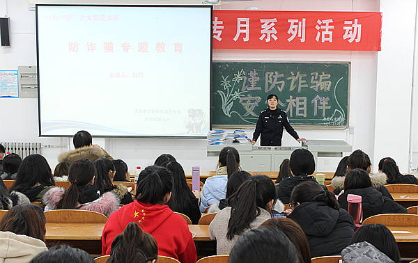2017年12月21日,山东女子学院工会妇委会、保卫处与社会与法学院共同举办了法制宣传系列活动之“谨防诈骗,安全相伴”防诈骗讲座,此次讲座面向全体在校学生开展。