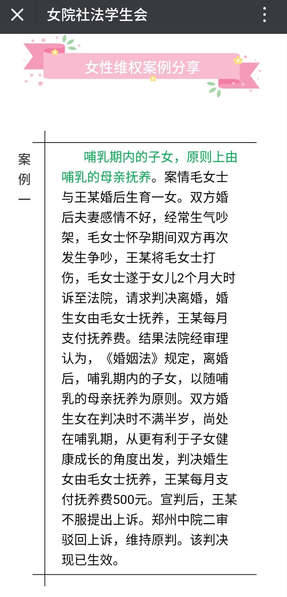 此次活动旨在增强女教职工和学生们的女性维权意识。为此,学院通过编辑专题微信话题,在微信公众号上发布了与女性维权、全面普及二孩政策相关的法律知识,进行主题普法宣传,通过对《妇女权益保障法》、《劳动合同法》、《婚姻法》等法律法规进行解读,引导学生们进行更深层次的思考,以此来提高学生们的积极性和参与度。此次微信推广活动方式的创新,扩大了宣传范围,同时极大地引起了学生们的阅读兴趣,并促使了全校师生学习相关法律知识。活动结束后,师生们纷纷表示受益匪浅。