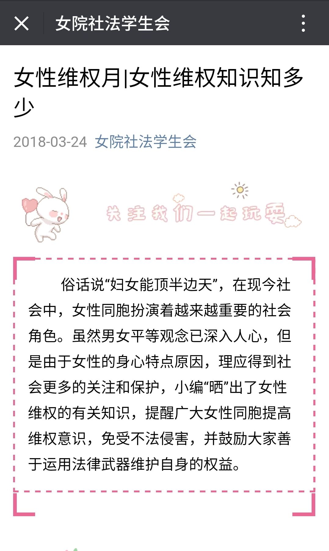 2018年3月23日,山东女子学院工会妇委会、社会与法学院联合举办了女性维权月系列活动之“女性维权正行动,法制女院建新功”微信推广活动,此次活动面向山东女子学院全体师生。