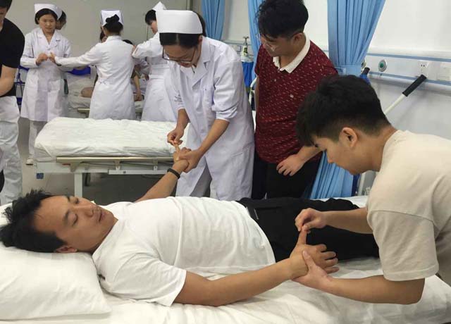 2018年5月13日,社会与法学院老年服务与管理专业学生在求实楼306、304开展了推拿按摩实训体验活动。