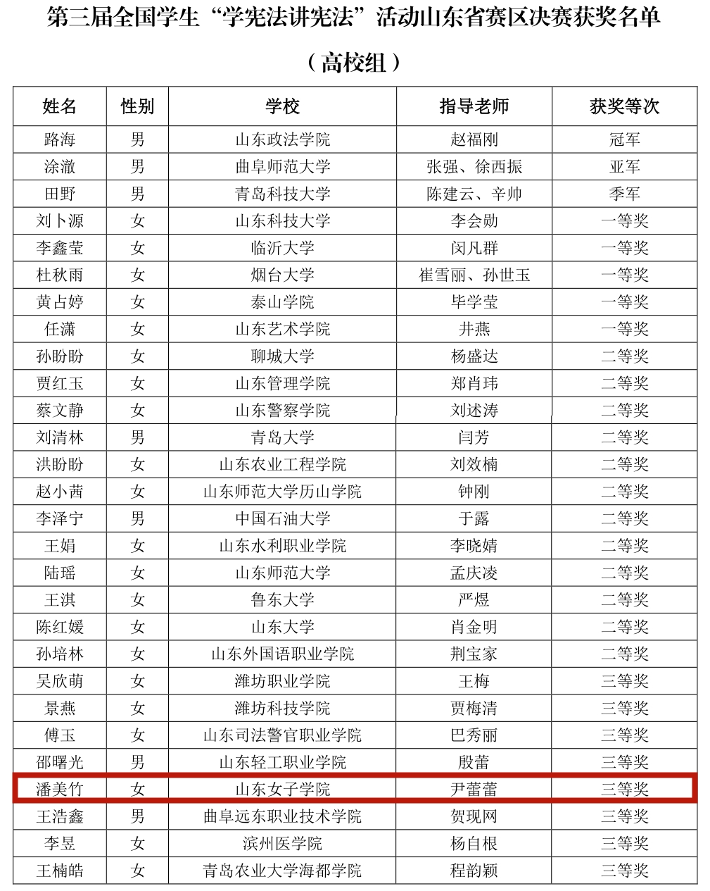 我院2017级学生潘美竹参加了第三届全国学生“学宪法,讲宪法”活动,在尹蕾蕾老师的指导下,以扎实的专业能力荣获山东省赛区高校组三等奖。高校组参赛队伍由山东59所高校组成,比赛内容包括演讲赛与“一对一”辩论赛。参赛选手围绕“学宪法 讲宪法”的主题,讲述发生在身边的宪法的故事,阐释他们对宪法的理解。经过指导老师尹蕾蕾的精心培训和指导,潘美竹在激烈的竞争中,以独特的选材角度与大方的演讲风格赢得了评委和观众的一致好评。比赛取得的优异成绩不仅展现了学院老师对培育学生专业素养的高度重视,也为学生今后参加此类比赛积累经验、提供方法指导打下扎实的基础。
