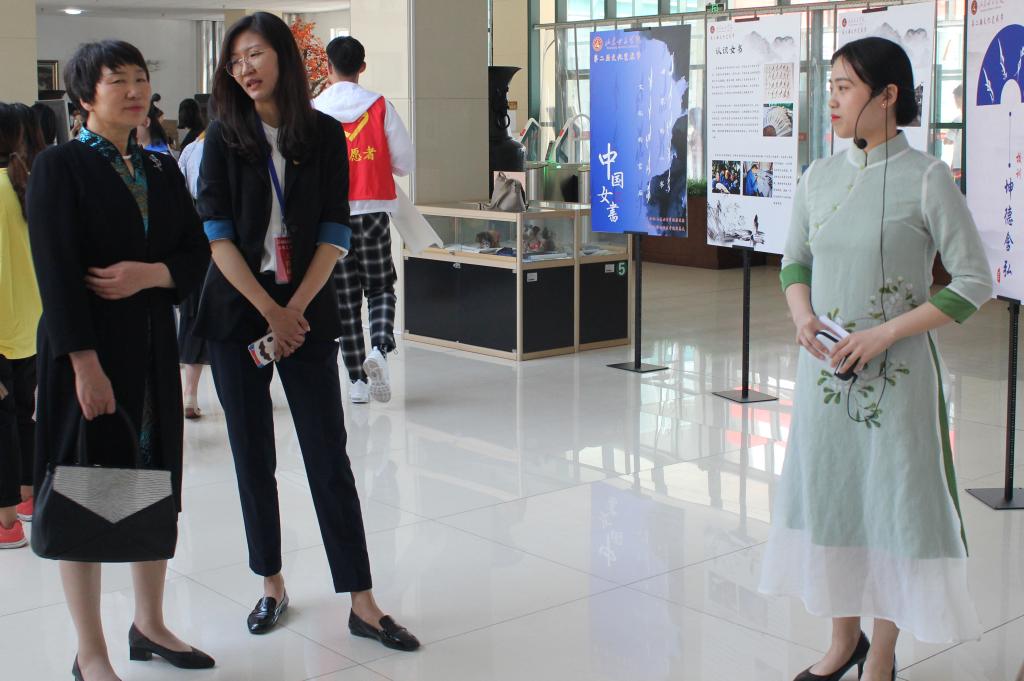 女书作为世界上唯一一种具有性别特征的文字,展现着女性的阴柔之美。此次社会与法学院以江永女书为展,旨在让女院师生在文化的氛围中感受女性的魅力。此次女书展览分六个篇章进行,从女书的简介到校训“坤德含弘,至善尚美”、院训“爱心奉献,公平正义”的解读,无一不展现出江永女书的特色,弘扬和传递女性的价值。展出过程中,我校党委副书记王淑霞、副院长侯素美、团委副书记苏靖前往展区了解女书文化,并提出疑问,与讲解员亲切互动,对此次展览进行了肯定,给予了高度的评价。学校学生也都立足展板前,感受女书的魅力,积极参与猜字互动,现场气氛热烈。