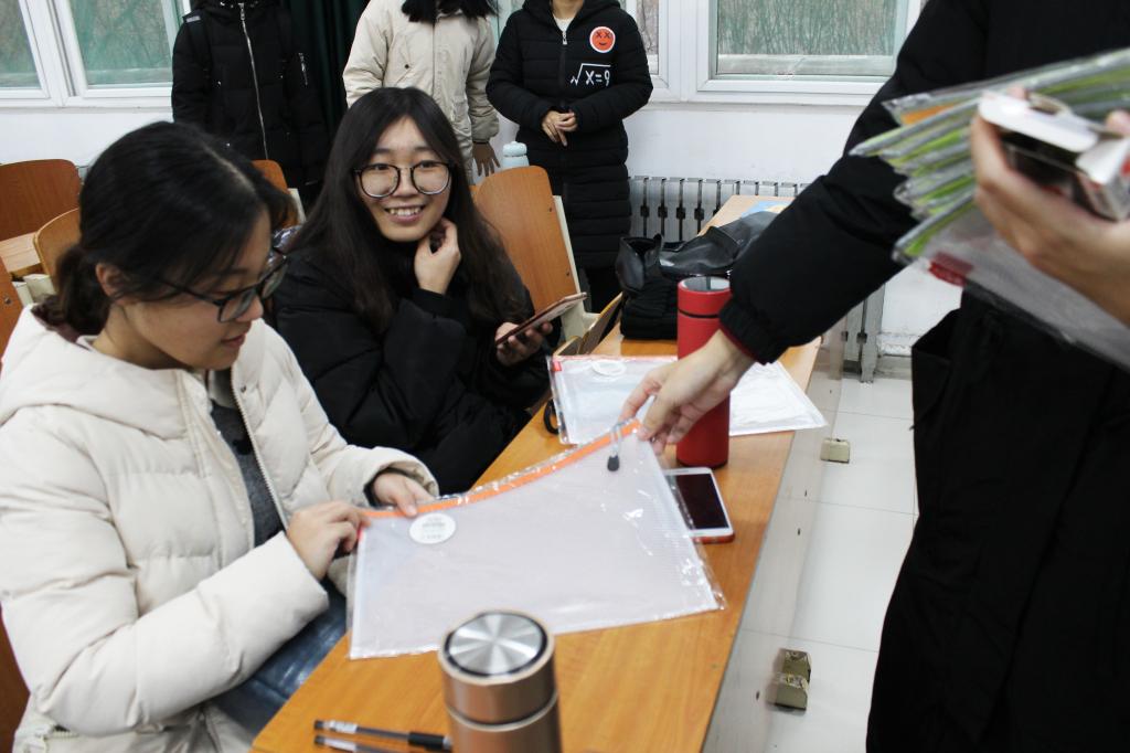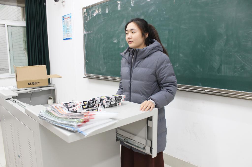 为鼓励考研学生积极应考,社会与法学院特意为考研学生购买了一批考试文具用品。2019年12月16日上午,社会与法学院2016级辅导员赵文烁老师在博学楼202为学院2016级考研学生分发考试用品。
