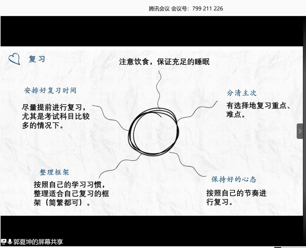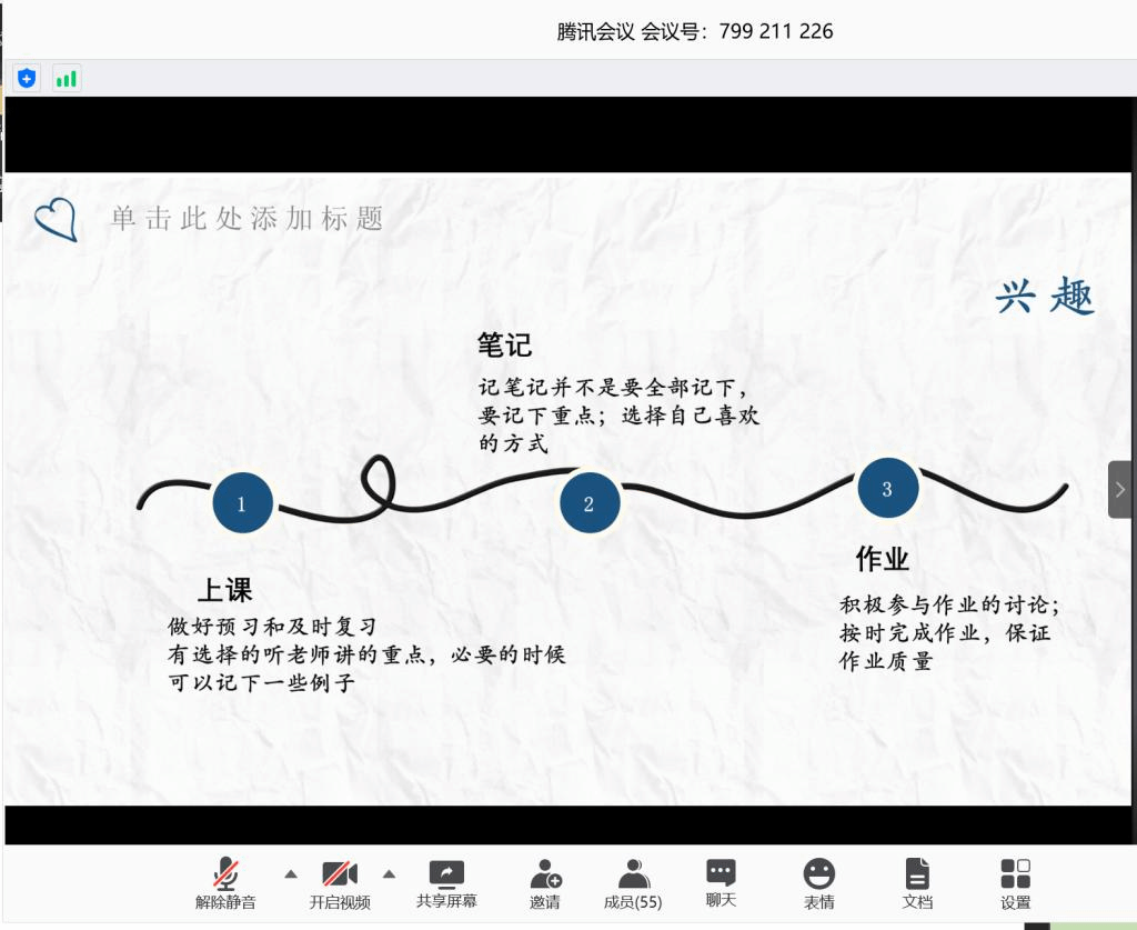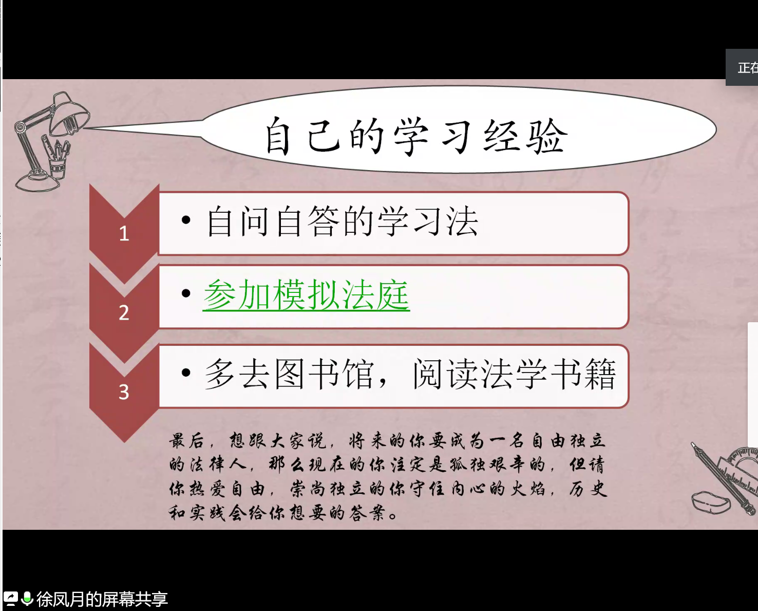 此次会议,主要针对学生们的学习方法问题进行交流。学习成绩多次排名第一的徐凤月针对提高法律研究兴趣、保持线上学习效率进行了讲解。对于提高兴趣,徐凤月叮嘱学生们关注时政中的法律热点,培养对法学的研究兴趣。紧接着,针对拖延、熬夜等居家学习中普遍存在的问题,徐凤月提出了制定计划、家长监督等高效学习方法,帮助学生们提升学习效率。随后,对于普遍关心的期末考试问题,学习成绩名列前茅的先锋学子郭夏坤希望学生们注意饮食、放平心态并保持充足的睡眠。郭夏坤还提到了高效利用课余时间学习的方法,建议学生们查阅书籍文献、积极参加模拟法庭并珍惜宝贵时间。最后,主持人对此次交流会进行了总结,呼吁学生们调整学习方法,珍惜时间,严于律己。
