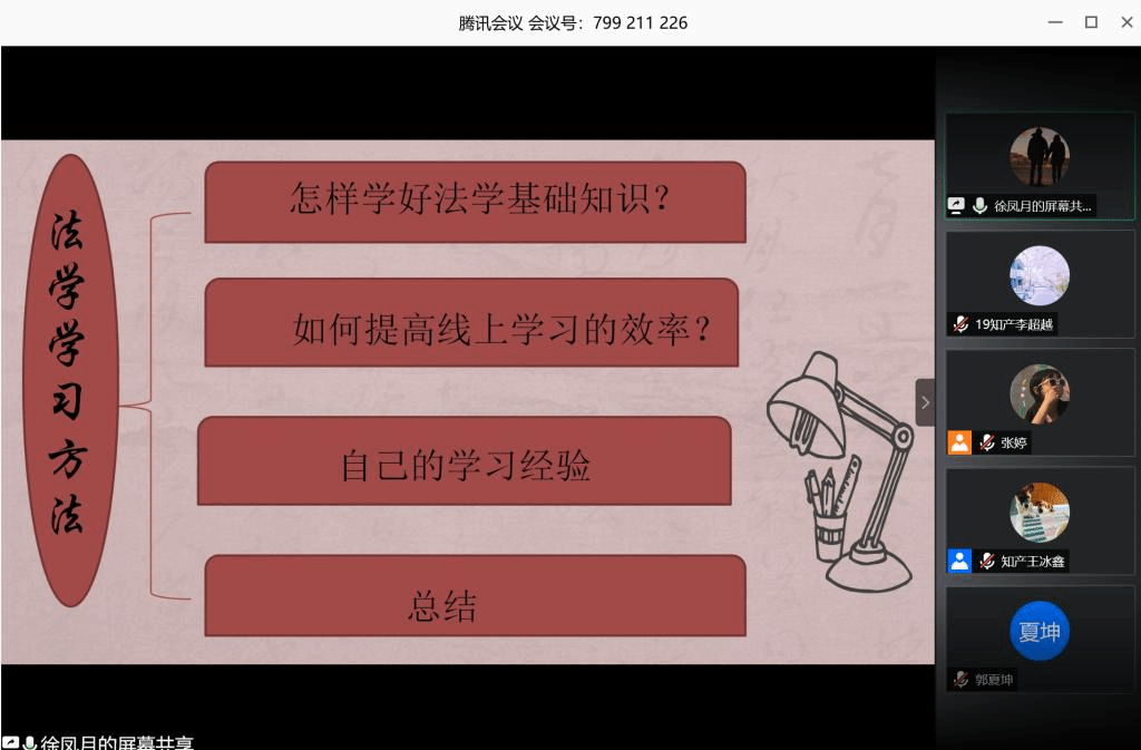 2020年5月28日下午,社会与法学院于腾讯会议举办了知识产权专业“先锋学子”学习方法交流会。此次会议的参会人员全部来自知识产权专业,由2017级先锋学子徐凤月、郭夏坤担任分享人,2018级和2019级全体知识产权专业的学生参与。
