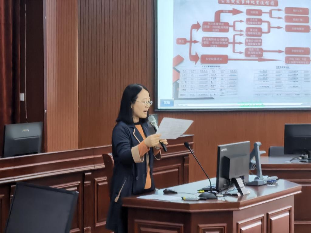 本次会议旨在加强学生宿舍管理工作,进一步改善学生的生活和学习条件。会议伊始,吴书记首先详细讲解了公寓突发事件处理流程图,给予了发生紧急事故时具体的应对方法。针对前期学校宿舍大检查的结果,从学生宿舍管理工作的实际情况出发,对宿舍卫生、宿舍安全以及宿舍文化三个方面提出了具体要求,吴书记指出要严格加强宿舍内务管理,不使用违章电器、不堆放垃圾杂物、床铺床下保持整洁,同时要注意消防安全、财产安全,加强火灾防范意识和防诈骗意识。最重要的是,党员和班干部宿舍的卫生要起到良好的带头作用,学院老师也会定期检查宿舍卫生,形成学生-干部-老师双效保障机制,共同营造干净和谐的宿舍环境。紧接着,张扬老师同时强调了心理辅导建设的重要性,同处社会与法学院这个温暖的大家庭,同学之间要彼此关爱、温暖守护,呼吁每一位同学理性平和地面对大学生活,学生干部要重视起每一位同学的心理健康,发现情绪波动较大、突遇心理危机的同学要及时上报心理辅导员,形成良性的心理氛围,共同守护大家的心理健康。