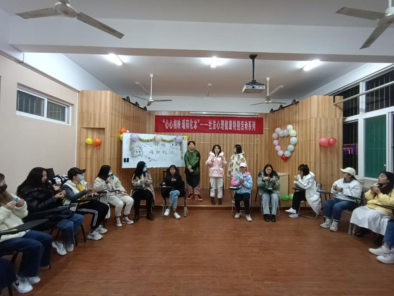 2020年11月22日晚,社会与法学院于求实楼620教室开展了“心心相映,暖阳化冰”心理健康系列活动。此次活动由学生会心理生活部部长聂晶莹组织,健康服务与管理专业龚飞同学主持,部分社会与法学院新生参与。