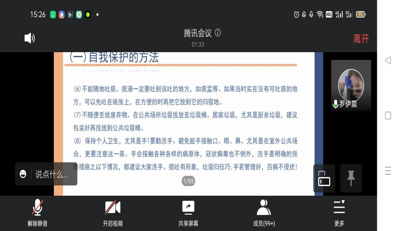 在会议中,主讲人还为同学们科普防疫小知识,教大家自我保护的方法,如咳嗽礼仪,无论是咳嗽、喷嚏、流鼻涕,一定要用纸张、手帕遮挡,不能对着别人喷嚏、咳嗽。人与人之间接触时,要保持半米以上的距离,尤其是面对面谈话时。如果必须要到人口密集的地方,须戴口罩。口罩一般2小时更换一次,最长不超过4小时。不能随地吐痰。保持个人卫生,要勤洗手。避免脏手接触口、眼、鼻。