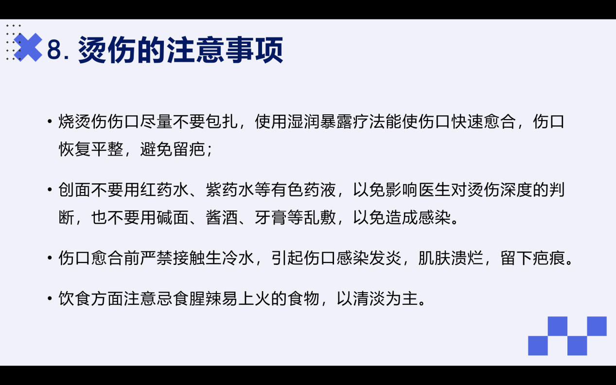 在此次宣讲中,主讲臧浩然同学首先介绍了在日常生活中的常见容易烫伤的地方,耐心讲解了烫伤的定义、程度以及如何处理创面等,并细心提醒同学们谨防烫伤。不仅如此,主讲人还为同学们讲解了烫伤的具体治疗方法以及如何预防烫伤,同时也为同学们推荐了适合使用的药物,正确引导同学们掌握处理烫伤的合理方法,以便同学们在之后的生活中处理一些不时之需。