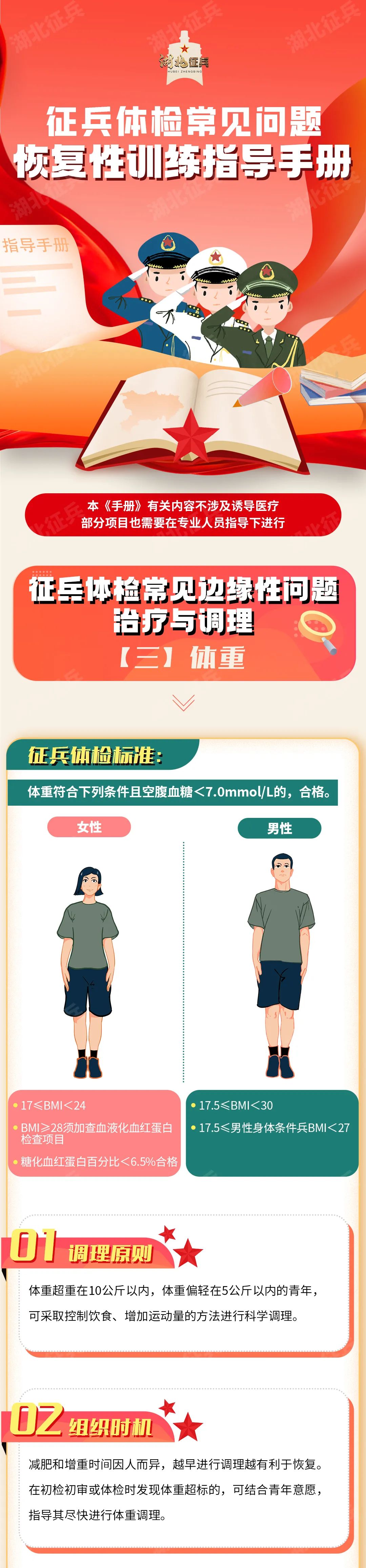 2023年春季征兵工作即将展开,从近几年工作实践来看,在征兵体检中,有很多应征意愿强烈的适龄青年因身体边缘性问题被淘汰,失去了参军报国的机会;也有少数应征青年征兵体检合格后,在入伍前一段时间里放松对自己的要求,导致部分体检指标不符合应征条件而被淘汰,最终与军旅无缘。