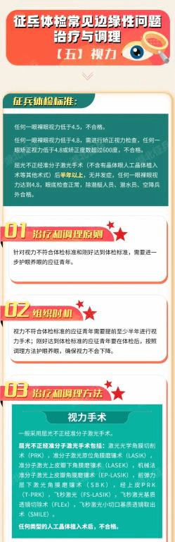 三是及时治疗。近视、腋臭、结石、痔疮等经过治疗不影响入伍的疾病要及早诊断治疗,留出足够的康复期(比如准分子激光手术矫正视力,手术时间距征兵体检时间应在半年以上)。