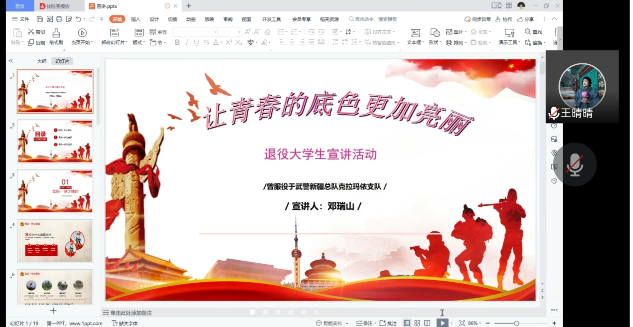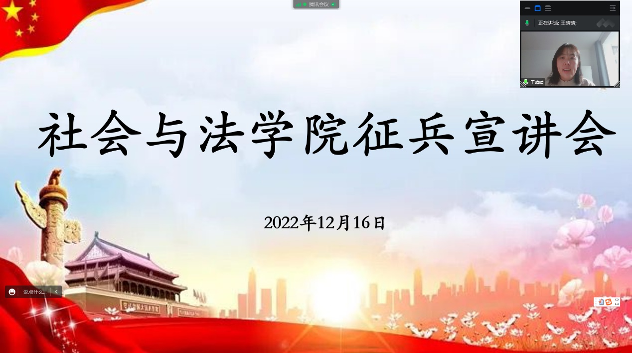 12月16日下午,社会与法学院面向全体同学召开线上征兵宣讲会。本次活动由王晴晴老师主持,学院优秀退伍复学学生邓瑞山、刘成斌应邀参与宣讲,各班学生代表及有参军入伍意向的学生参与了本次会议。