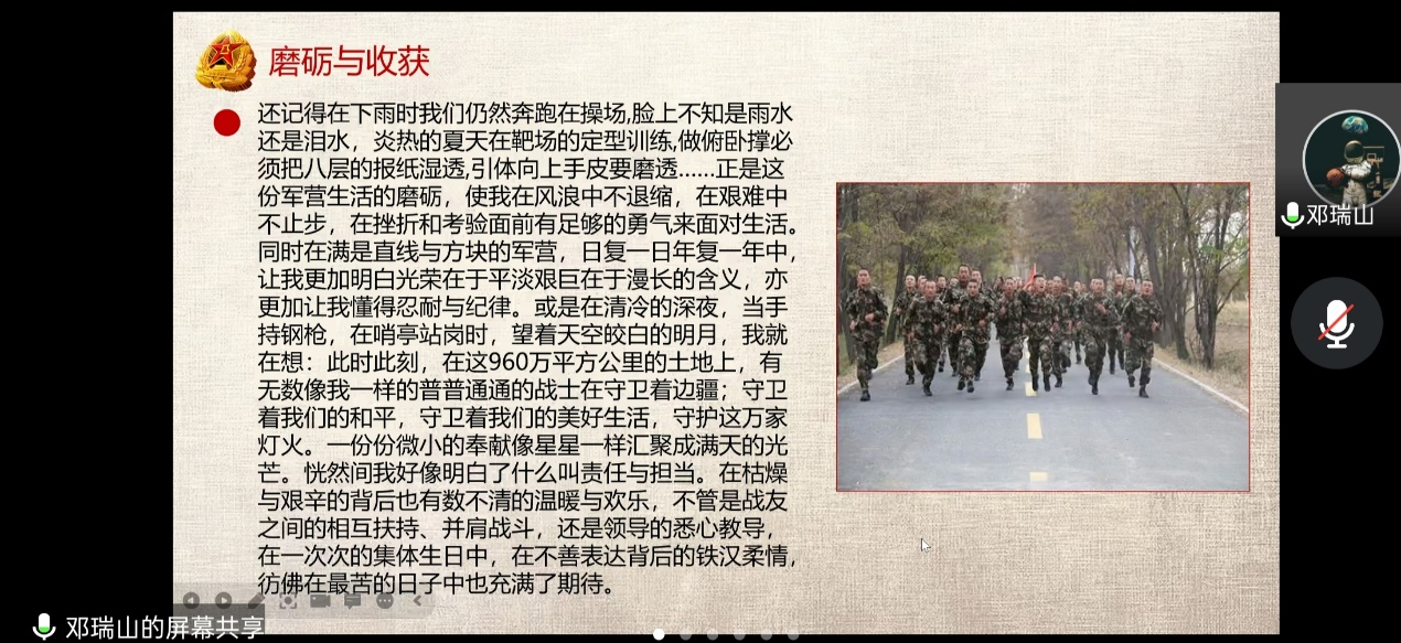 最后,由已经退伍复学的在校生邓瑞山、刘成斌两名同学做了经验分享。二人从入伍原因、军旅生活以及个人感悟方面进行了阐述,并向参会学生分享个人在军队的日常生活,展现了士兵刻苦勤奋以及军营温馨团结的风气,并且鼓励大学生应积极参与征兵活动。