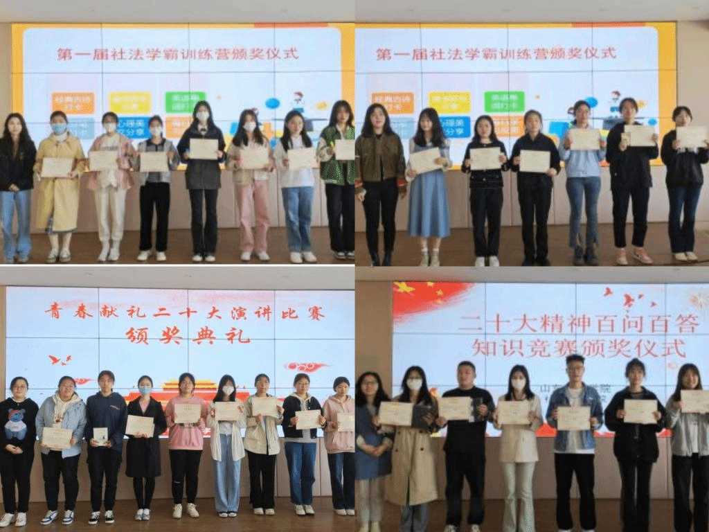 大会伊始,杨洋书记为在“省级三创赛”、“互联网+大赛”和“省级社工案例大赛”、“山东省学宪法讲宪法比赛”等省级学科竞赛中获奖的学生颁奖,鼓励学生们在新学期、新比赛中再创佳绩。张扬、刘汝婷老师为在“党的二十大精神百问百答知识竞赛”,“青春献礼二十大演讲比赛”中脱颖而出的学生颁奖,对学生们积极学习二十大的态度予以充分肯定,并指出青年学生应当积极向党组织靠拢,以更加多元化的形式在实践中不断丰富自己的内涵。吴玉霞书记为在“挑战杯课外学术作品竞赛”中获奖的学生颁奖,对学生们“崇尚科学、追求真知、勤奋学习、锐意创新、迎接挑战”的态度予以表扬。王晴晴、吕雅琦老师为在第一届学霸训练营中取得优异成绩的学生颁奖,总结了第一届训练营的成果,宣布开启第二届学霸训练营,学霸训练营负责人柏闰春从英语单词打卡、新闻稿写作、每日学习笔记打卡、心理美文阅读打卡、竞赛分享专项训练营、二十大金句打卡六个专题进行开营介绍,鼓励学生积极参与、认真对待学霸训练营活动。大会最后,吴玉霞书记对本次表彰大会进行总结,再次对获奖学生给予祝贺和表扬,希望广大同学在未来砥砺前行依旧,无悔青春,无愧自己。