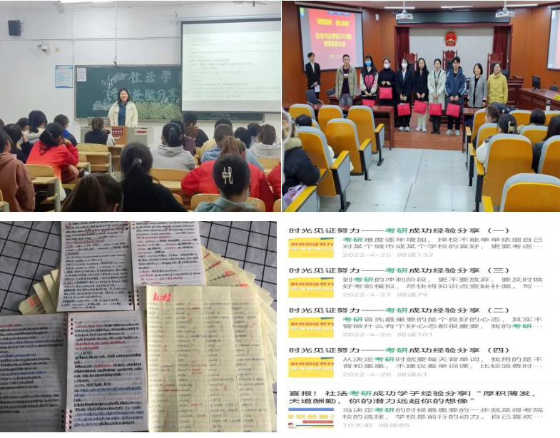 长期以来,社会与法学院以学科建设为引领,以学风建设为基础,狠抓教育教学质量提升,在不断的探索与实践中形成了自己的工作传统与特色。在日常管理中始终坚持以人才培养为中心,以强化学风建设为主线,将考研作为学生就业的有力抓手,把学生考研作为衡量学院教育教学质量和学风建设成效的重要标志。近几年学院考研报考率、上线率和录取率均节节上升。在社会与法学院师生的共同努力下,学院自上而下营造了较为浓厚的考研氛围,学生的考研热情逐年高涨。学院禀持“仁爱 崇法 省躬 笃行”的院训,不断加强师资队伍建设,推动学科专业融合发展,为提高人才培养质量打下了坚实基础。