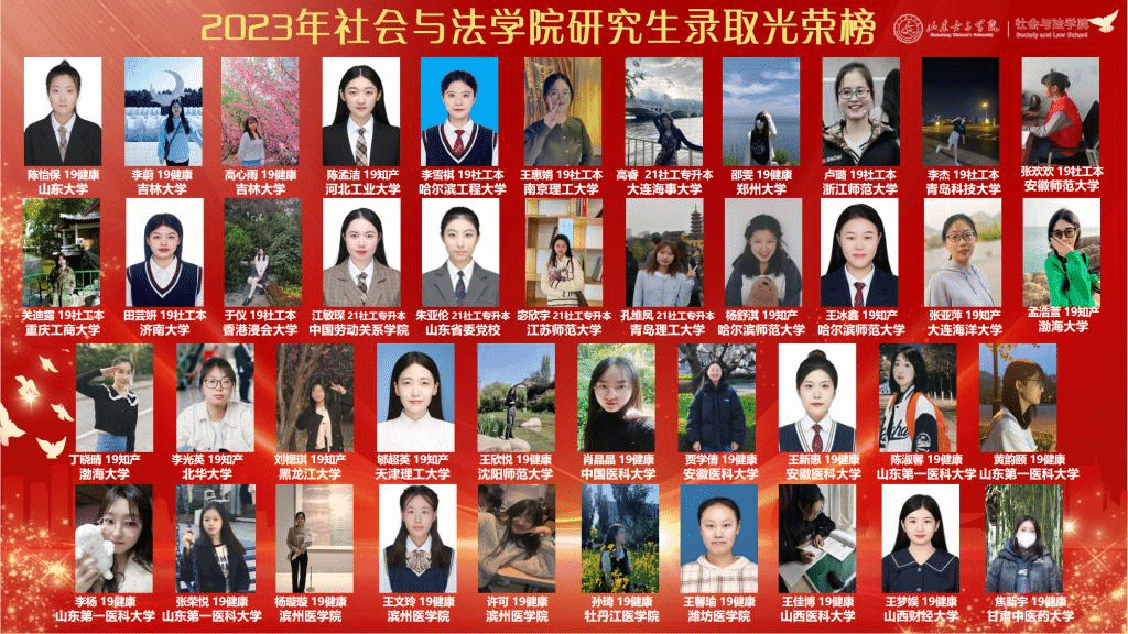 近日,随着2023年全国硕士研究生招生录取工作接近尾声,社会与法学院毕业生考研成绩再创新高。学院2023届本科毕业生共179名,110名同学报考研究生,53名同学上线,43名同学被录取,上线率29.6%,录取率24.02%,其中不乏山东大学、吉林大学、香港浸会大学、哈尔滨工程大学、南京理工大学、大连海事大学、河北工业大学、郑州大学等全国知名高校。健康服务与管理专业2023届毕业生50人,20名同学被录取,录取率达到40%。